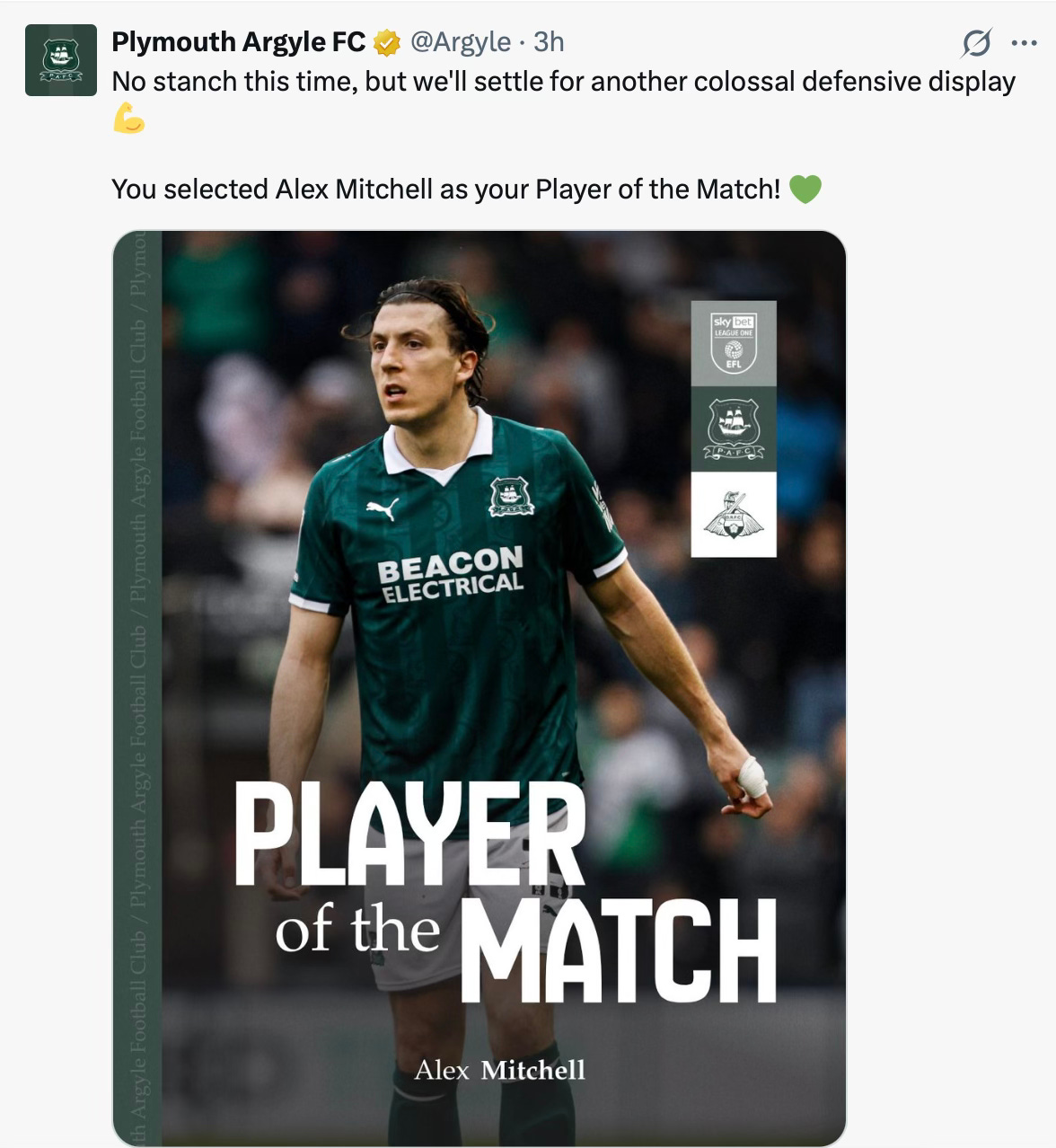 Alex Mitchell was voted Plymouth’s star performer in their 2-1 home win against Doncaster Rovers on Saturday