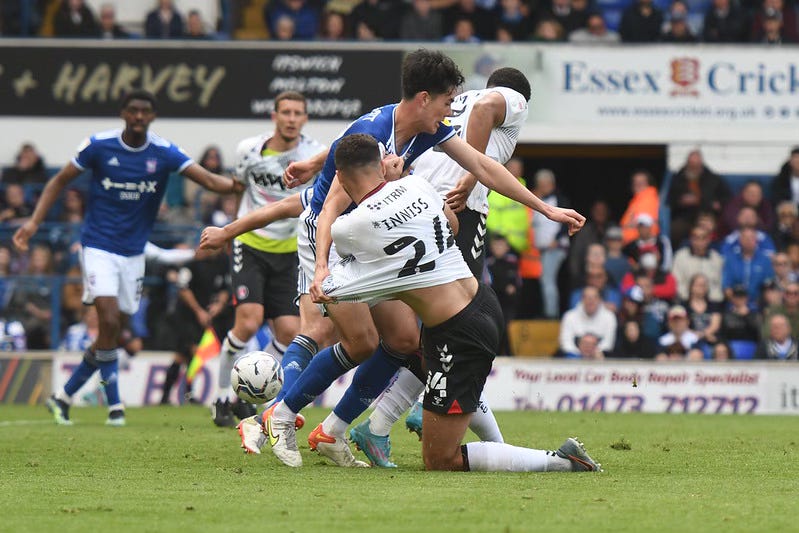 Ryan Inniss got his marching orders when Charlton Athletic last played at Portman Road