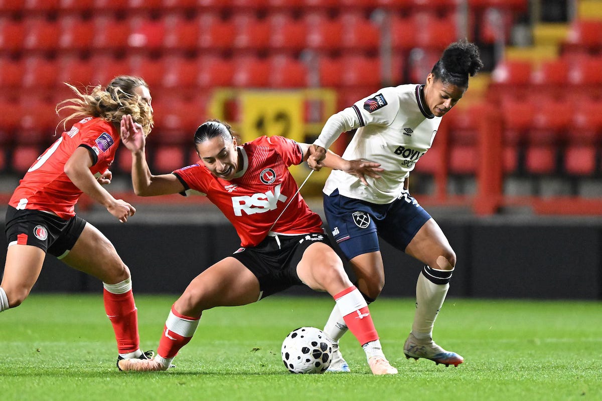 Gloria Siber is challenged during Charlton’s League Cup loss to West Ham United