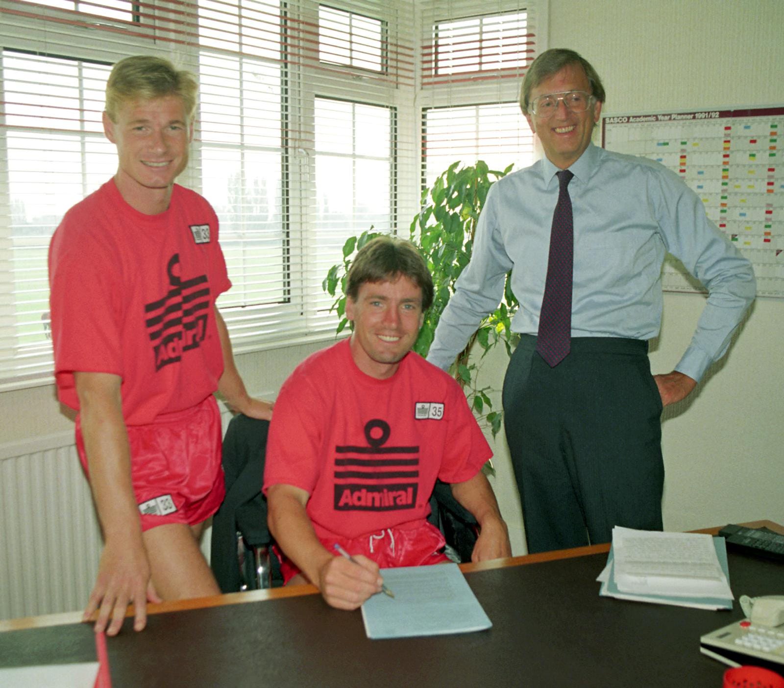 Garry Nelson (left) and Steve Gatting (middle) sign for Charlton in 1991 with chairman Roger Alwen happy at the two additions/Picture: Tom Morris