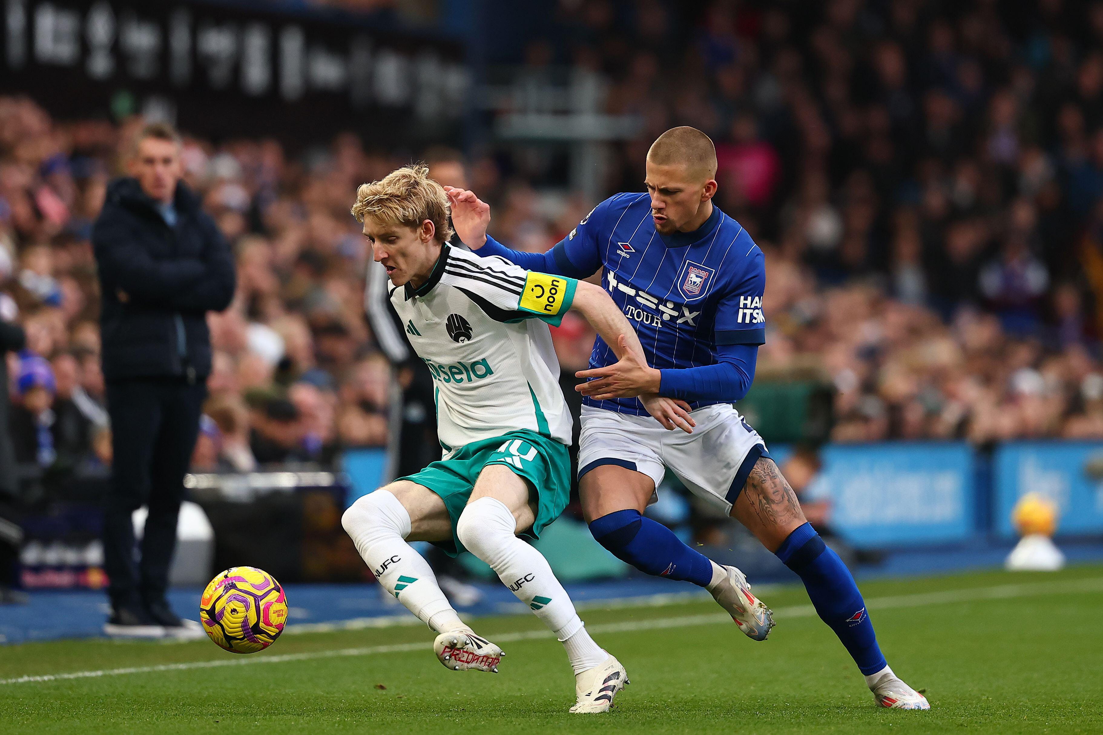 Ipswich Town defender Harry Clarke closes down Newcastle attacker Anthony Gordon during a Premier League match at Portman Road in December 2024/Picture: Alamy