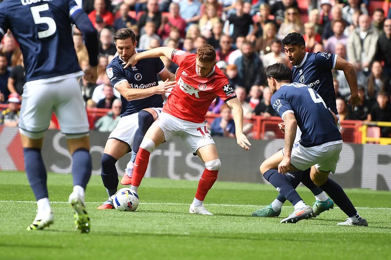 Charlton goalscorer Sonny Carey is surrounded by Millwall players