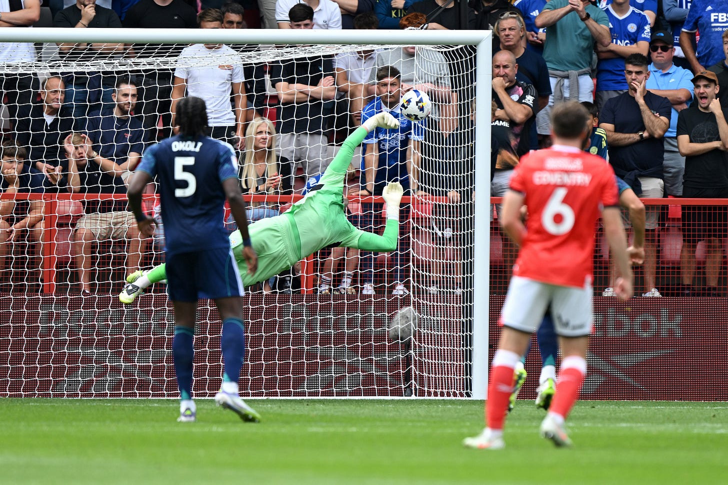 Conor Coventry’s shot is tipped over the bar by Leicester City goalkeeper Jakub Stolarczyk