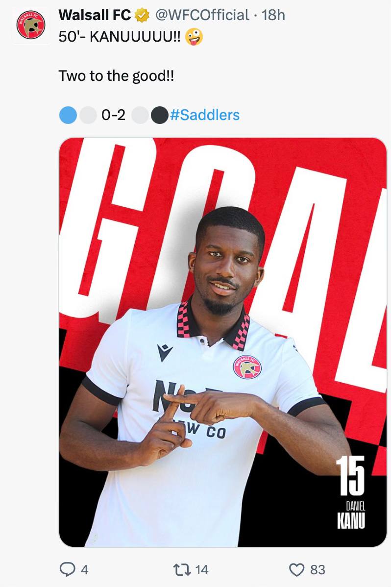 Walsall’s tweet on X after Daniel Kanu scored in their FA Cup tie at Eastleigh’s Silverlake Stadium