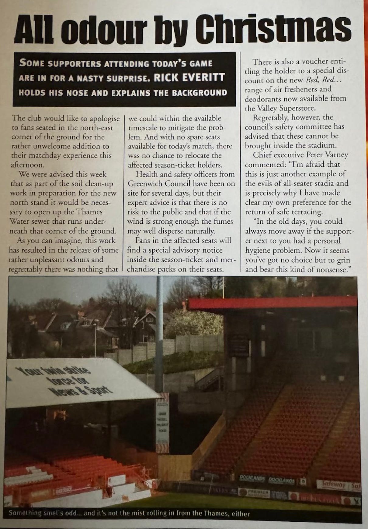 We put one out in the programme before the Leicester City match in 2001 - the game fell on April 1 - saying that regrettably, in the week leading up to the match, we had needed to open up the sewer that runs underneath the north-east corner of the stadium as part of soil clean-up work.