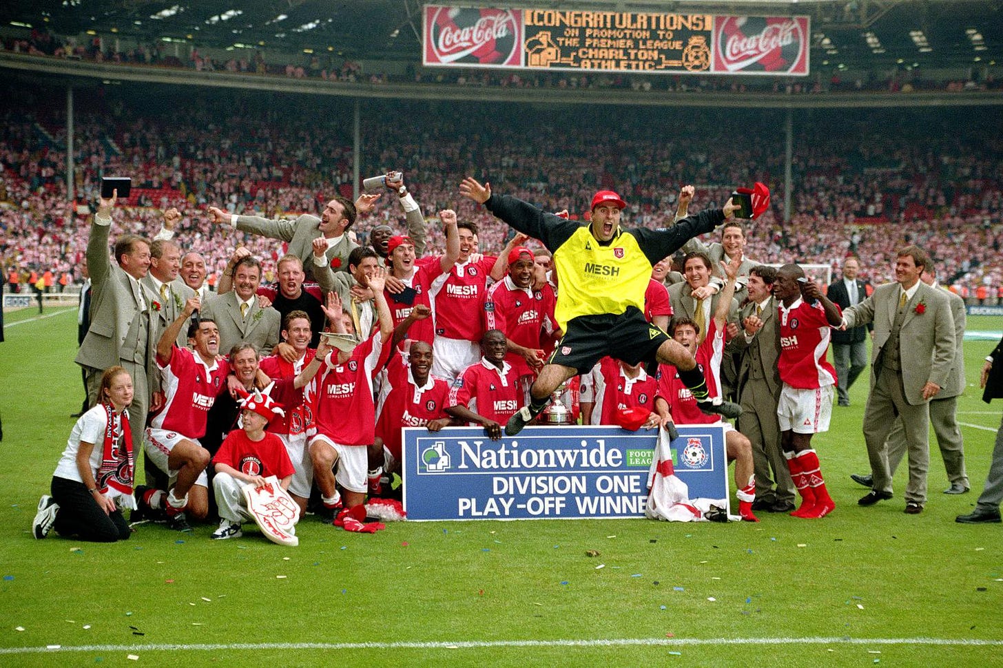 The 1998 First Division play-off final is rightly regarded as one of the greatest games played at the old Wembley. Charlton Athletic’s match against Sunderland see-sawed between glory and despair. It finished 4-4 after extra-time and the shredded nerves of supporters, not to mention players and coaching staff, then had to endure a penalty shootout, which the Addicks won 7-6. Clive Mendonca, a Sunderland fan, scored a hat-trick, the first player to achieve the feat in a play-off final.