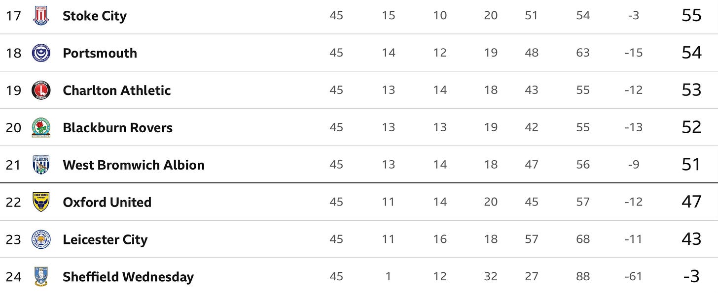 The bottom of the Championship table (Source: BBC)