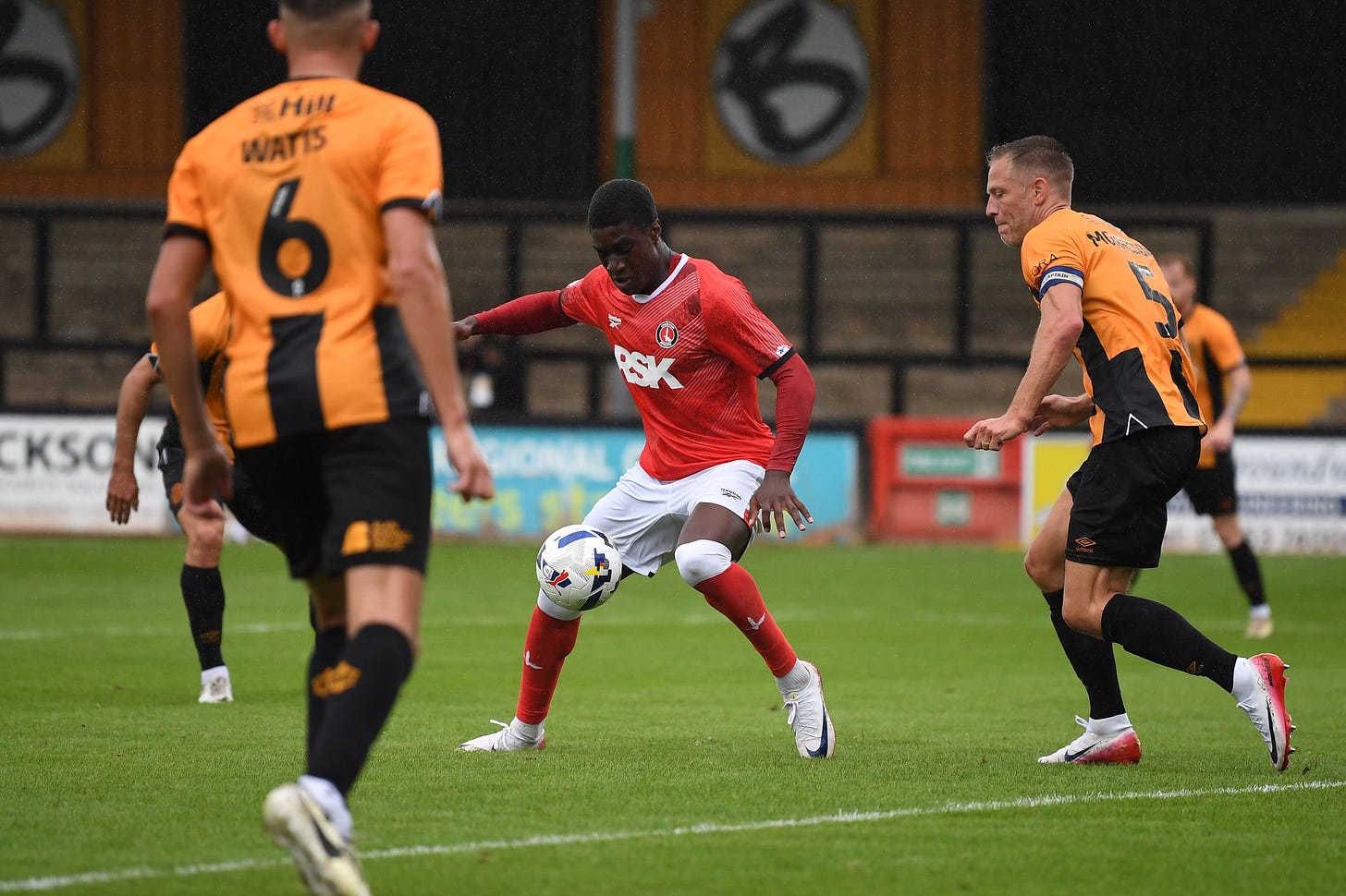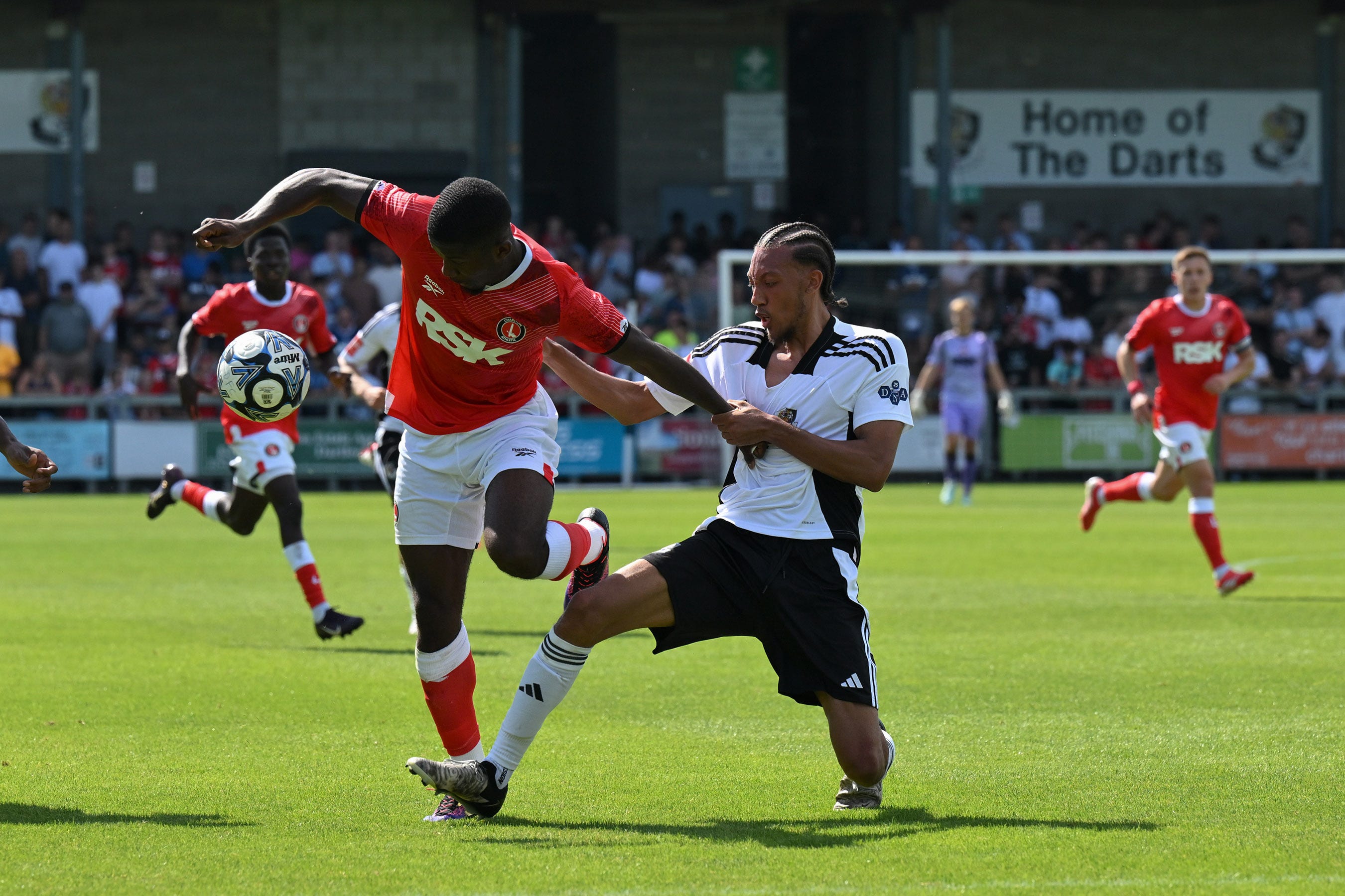 Daniel Kanu is tackled during Charlton’s pre-season friendly against Dartford in July