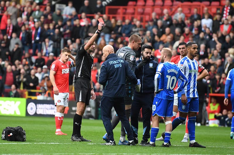 The official dismissed the Wednesday goalkeeper with opposition boss Henrik Pedersen indicating it was the linesman who spotted the foul.