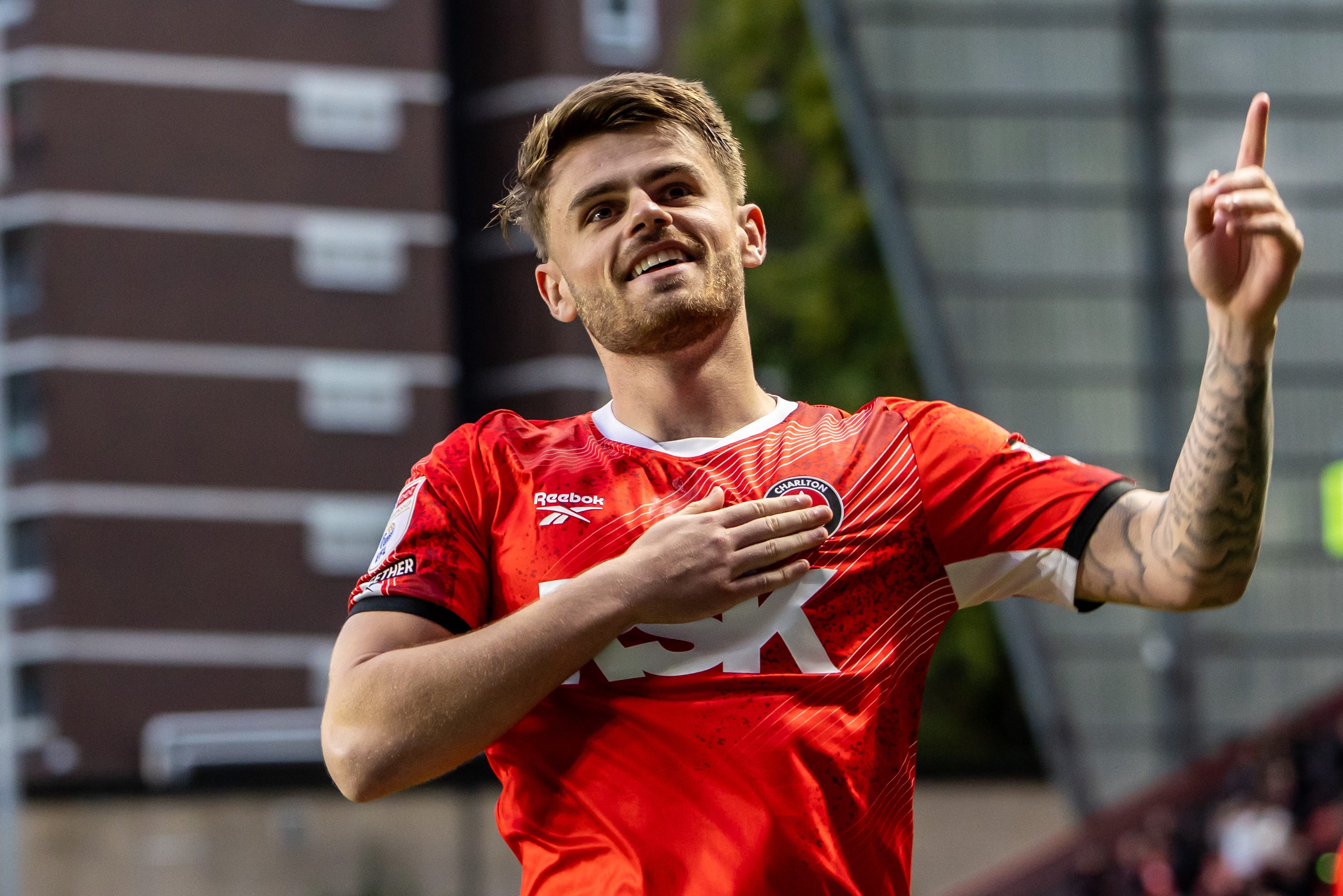 Charlie Kelman places his hand on the Charlton Athletic badge as he celebrates scoring in front of the Covered End