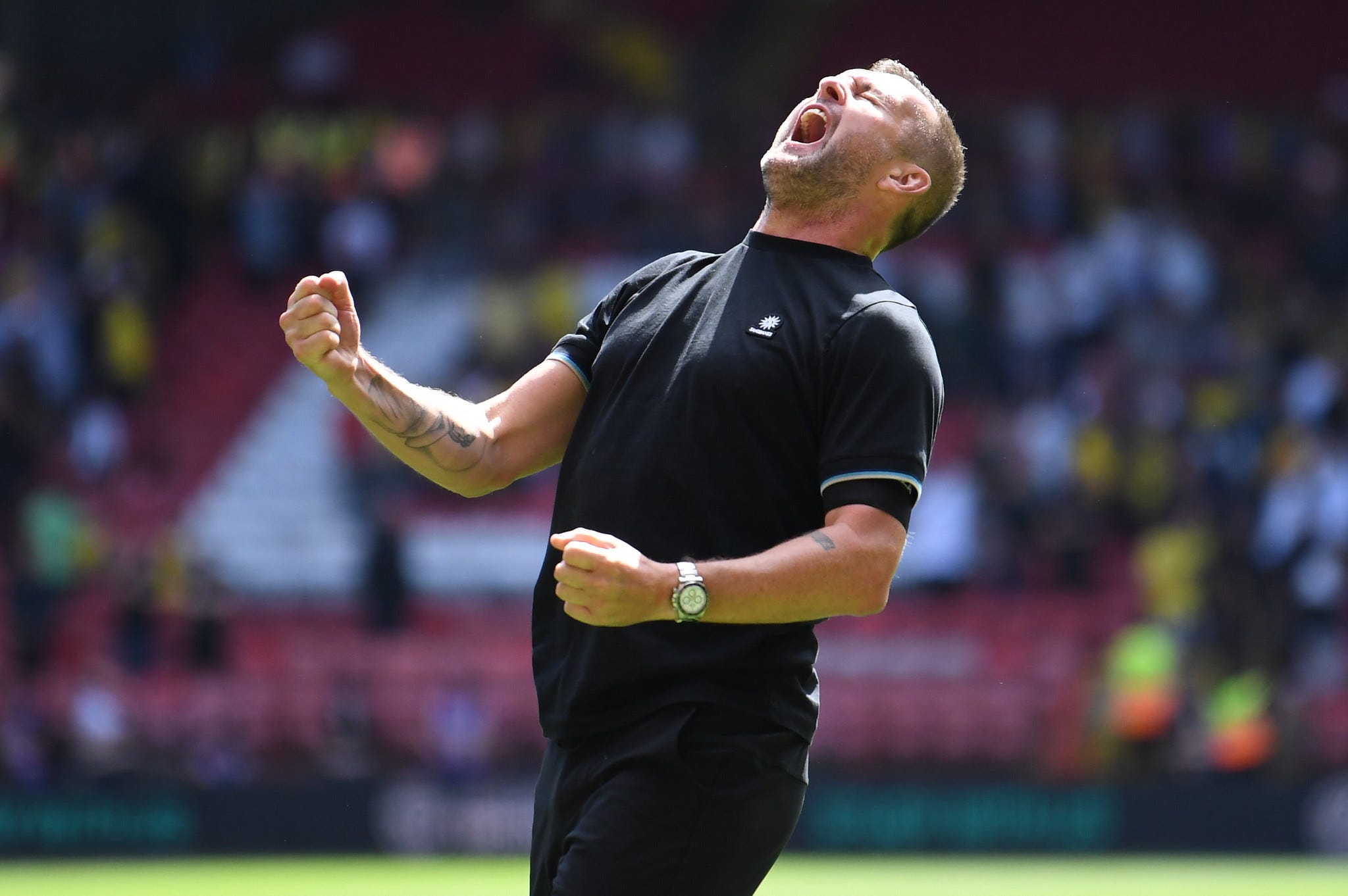 ATMOSPHERE AT FULL-TIME AND PUMPING HIS FIST TOWARDS WATFORD’S TRAVELLING FANS